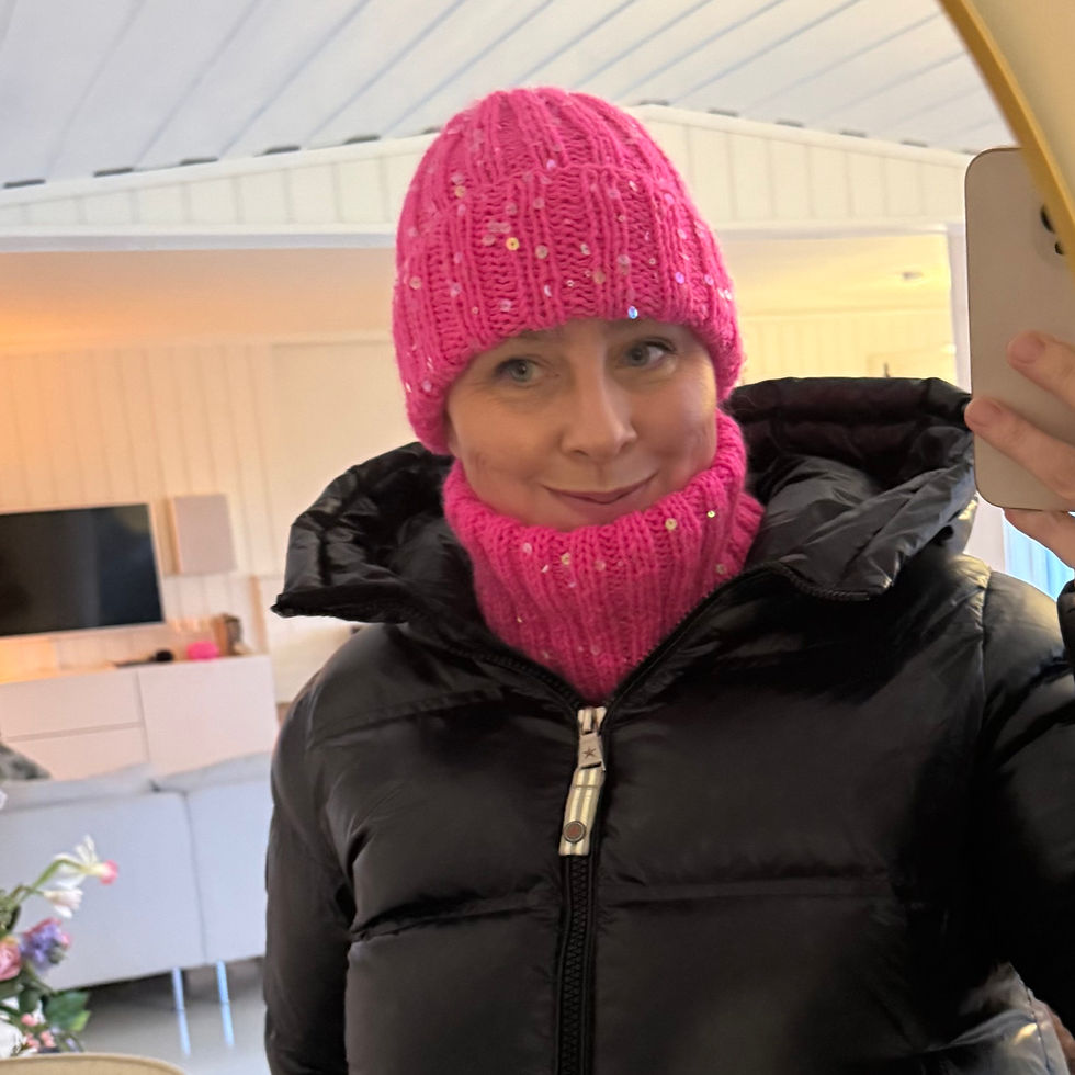NB: Halsen strikkes med paljettgarn på første halvdel og så videre kun med Wool. På denne måten har man ikke paljetter tett mot halsen. Delen uten paljetter skal brettes innover.